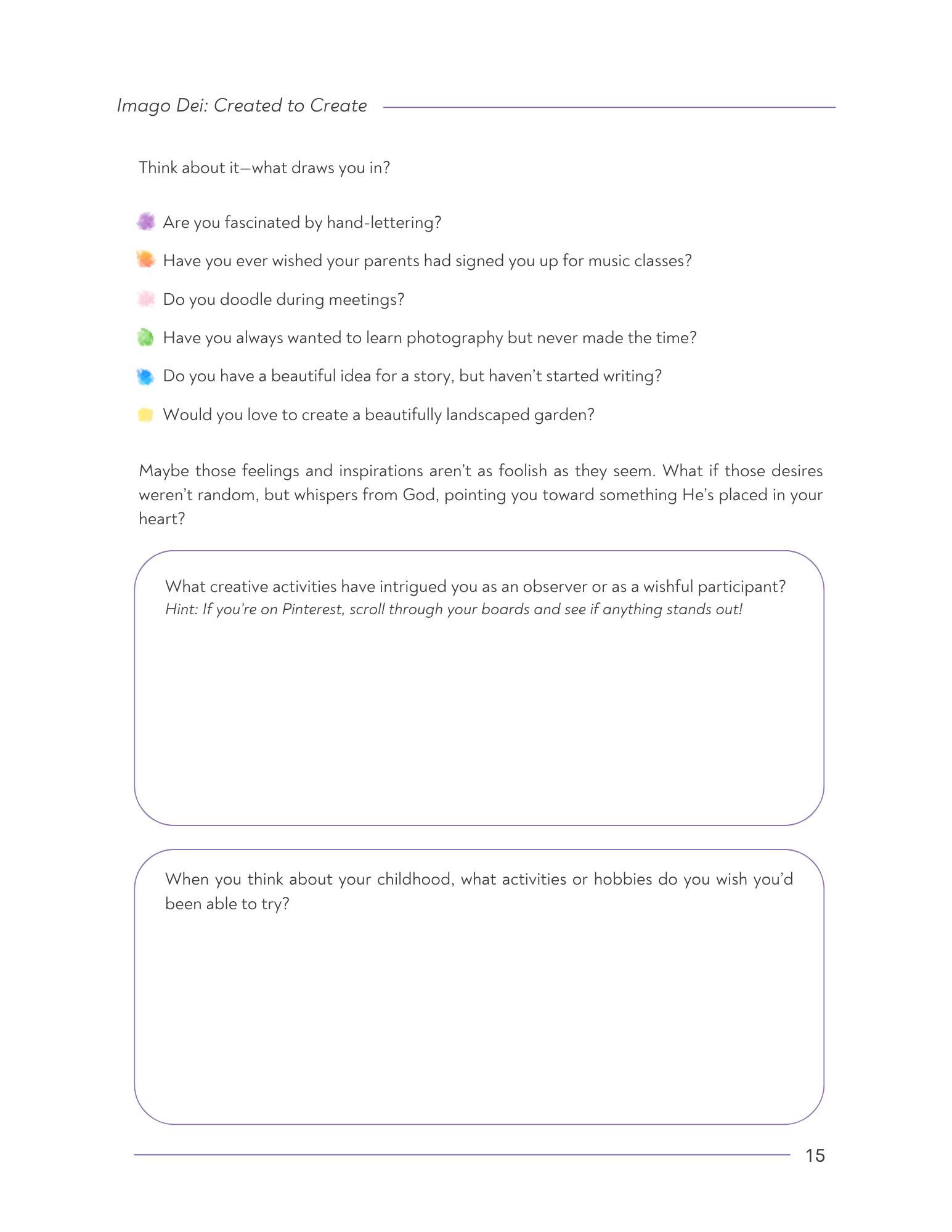 The Call to Create with Him – Practical encouragement and prompts to help you overcome creative fears and start seeing your creativity as a collaboration with God.